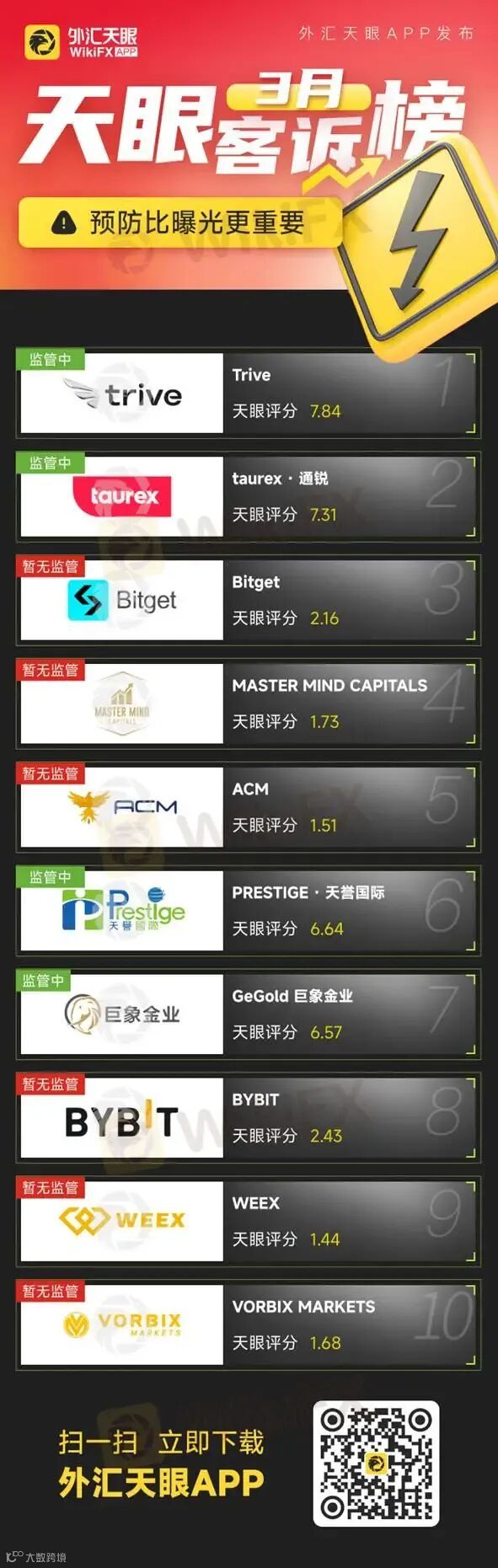3月高频投诉榜单显示,上榜平台多集中面向中国客户。加密平台跨界TradFi业务普遍采用“离岸监管+加密牌照”架构,合规约束力与资金透明度不足,投资者务必审慎评估风险。
