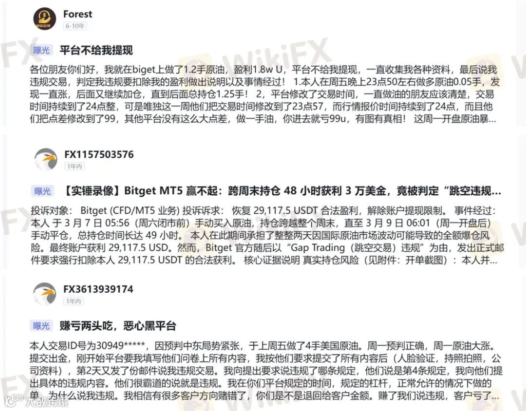 Bitget于2026年1月推出TradFi业务,由毛里求斯持牌机构BTGT Mauritius Capital运营。上线三个月内即爆发多起纠纷:用户做多原油因跳空行情盈利后,平台以“Gap Trading违规”为由强制扣除利润。