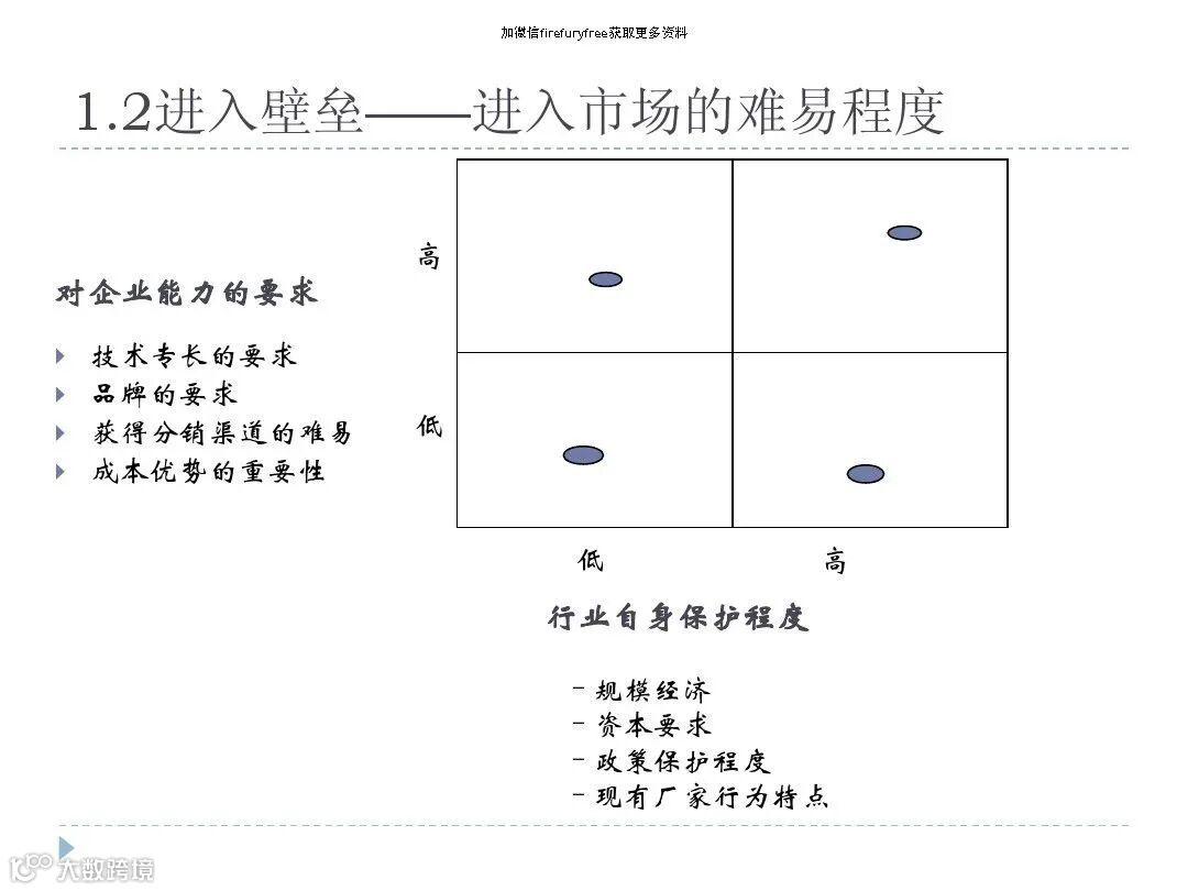 壁垒要素:技术门槛(如芯片制造需EUV光刻机)、品牌认知度、分销渠道获取难度。