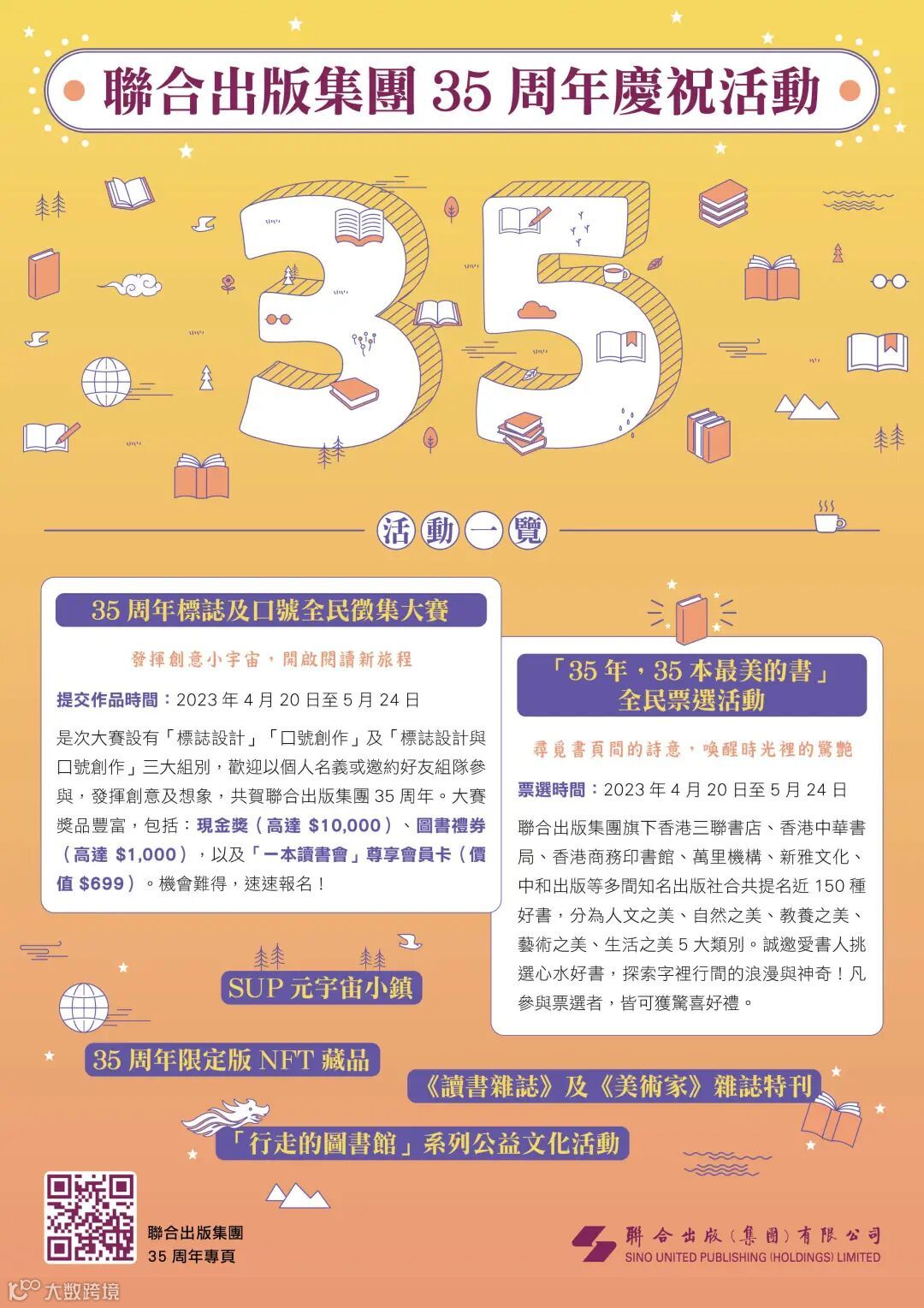 其中「35年,35本最美的書」全民票選活動由聯合出版集團旗下香港三聯書店、香港中華書局、香港商務印書館、萬里機構、新雅文化、香港中和出版、香港教圖、聯合培進、北京時代聯合等多間知名出版社合共提名近150種好書,分為人文之美、自然之美、教養之美、藝術之美、生活之美5大類別。誠邀愛書人挑選心水好書,探索字裏行間的浪漫與神奇。凡參與票選者,可獲驚喜好禮。