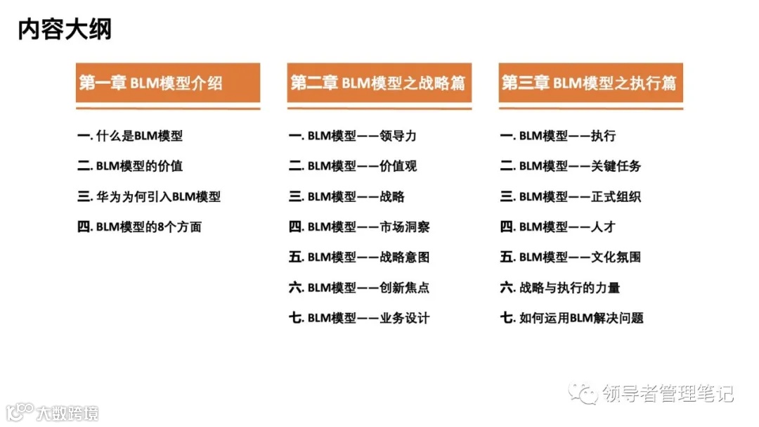 ►领导者说:★BLM模型(Business Leadership Model),中文通常被翻译为“业务领导力模型”或者“业务领先模型”,是IBM在2003年推出的一套连接企业战略制定与执行的战略管理方法,因为华为的引入和使用而被众多的中国企业所熟知。这套方法使用的概念体系,与企业管理实践中常用的概念体系有明显差异,因此增加了理解上的困难。我们对这套方法的底层逻辑进行剖析之后发现,这套方法与我们此前总结推出的“华沣战略解码系统(HSDS)”基本一致,就其系统性而言,算得上战略管理方法中的佼佼者,值得解读和学习。