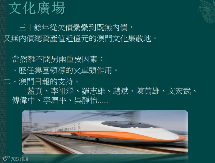 陳雨潤先生特別強調,澳門文化廣場之所以從資不抵債,倒閉邊緣發展到今天成為澳門的文化旗幟,除了公司高管的堅持不懈,以及上述種種逆境自強經營策略外,更重要的是依賴集團歷任領導的火車頭作用,給予澳門文化廣場很大的發展空間和行政自主。其中大部份領導都具有高學養、高智慧、高要求,敬業、專業、前衛、懂政治的特質,同時對下屬不吝嗇、不為難、如親人般愛護。