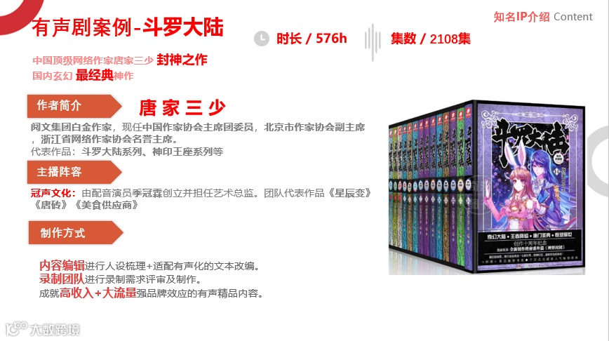 接着,陳強分享有聲閱讀產品的生產流程,主要分為四大項:內容策劃、內容改編、音頻錄製及運營。