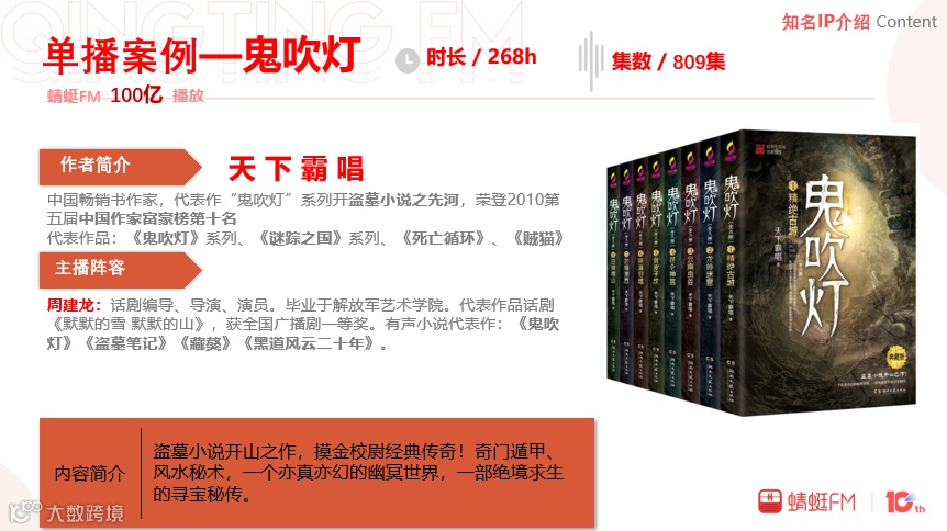 音頻錄製環節會透過監製、畫本、主播、對軌、審聽、後期等不同製作組完成成品。當好IP遇上好演播者就能打造爆款產品,例如蜻蜓FM上的《鬼吹燈》。這個系列可謂稱得上是盜墓小説開山之作,其作者是中國暢銷書作家,榮登2010年第五屆中國作家富豪榜第十名,可見IP背景強大,受眾龐大。而蜻蜓FM《鬼吹燈》這款爆款產品,正是因為結合了影響力大的作者、專業的主播和後製音效加工剪接,在十年間的播放量達到了100億次。