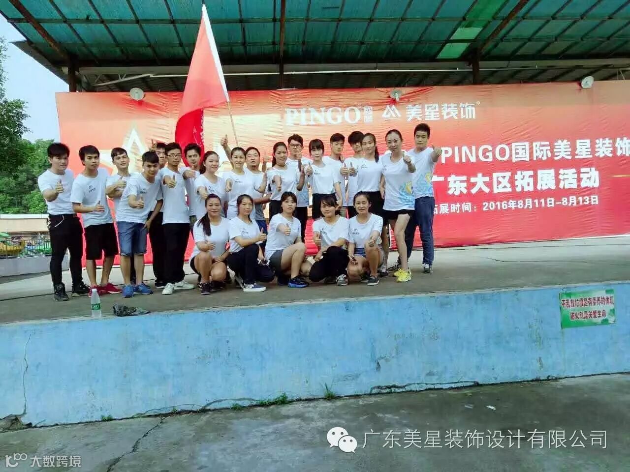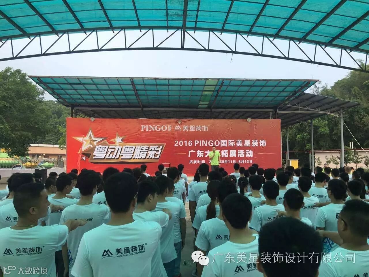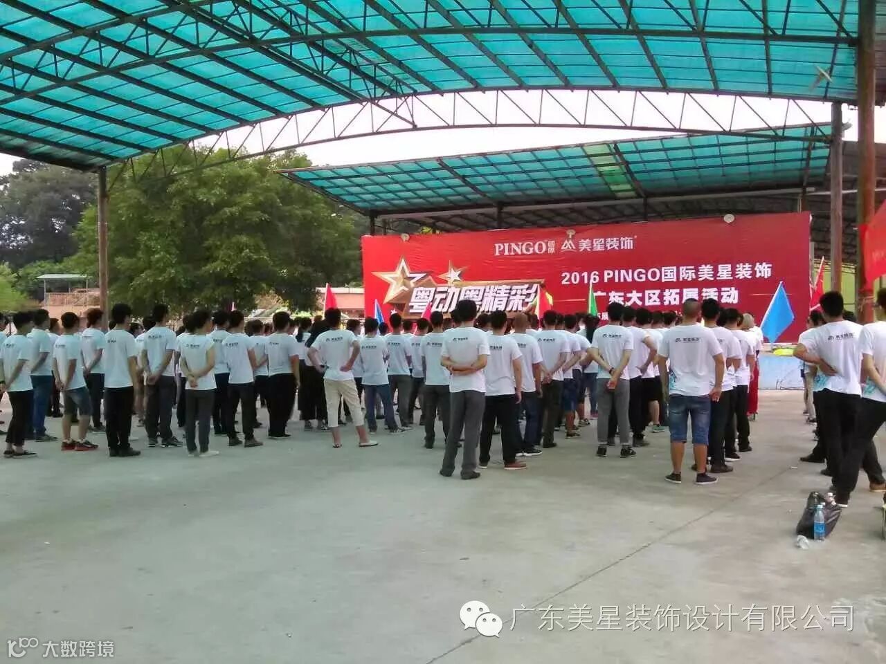 2016年8月11日,PINGO国际2016“粤动.粤精彩”广东美星装饰拓展活动盛大开营,来自美星装饰广东大区:阳江,北滘,乐从,白云,大沥,中山,鹤山,惠阳,塘厦,清远,高州,罗定,汕头,韶关,梅州,江门,兴宁,增城,罗村,丹灶共20家分公司300名家人在佛山高明塘伙训练基地参加为期3天的培训。