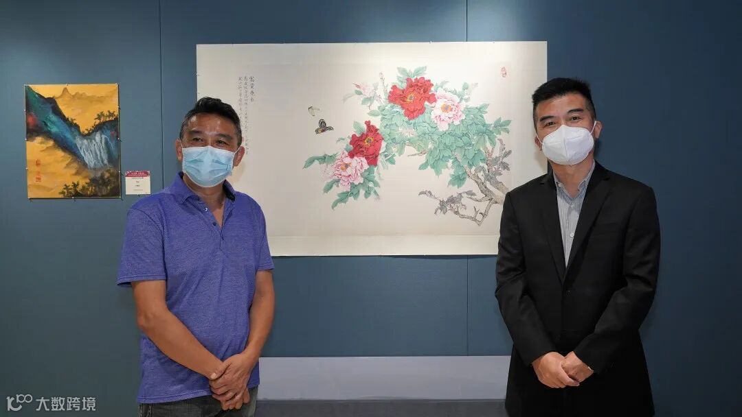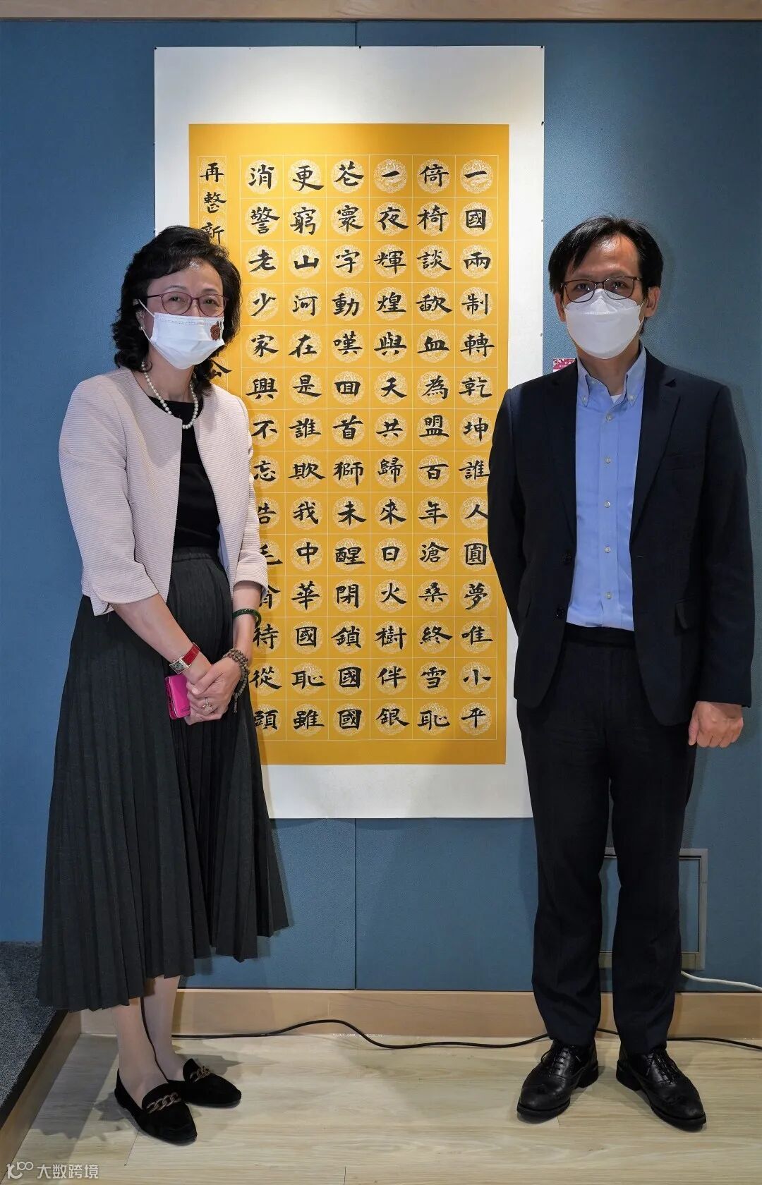圖 | 董事副總裁梁兆賢和董事副總裁吳靜怡在書法一等獎作品前合照