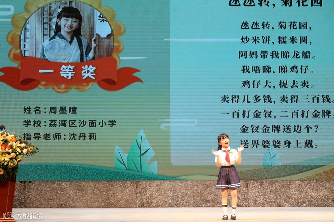 隨後登場的喜馬拉雅粵語頻道主播李沛聰老師,從粵語發音的講解到案例示範,為學生帶來了最純正的粵語發言。大灣區文化人緣相親、語言相通、民俗相近,粵語作為大灣區的文化名片之一,本次大賽也專門為此準備了多個粵語童謠,以從荔灣為原點之一出發的廣府文化為脈,進一步宣傳嶺南文化。