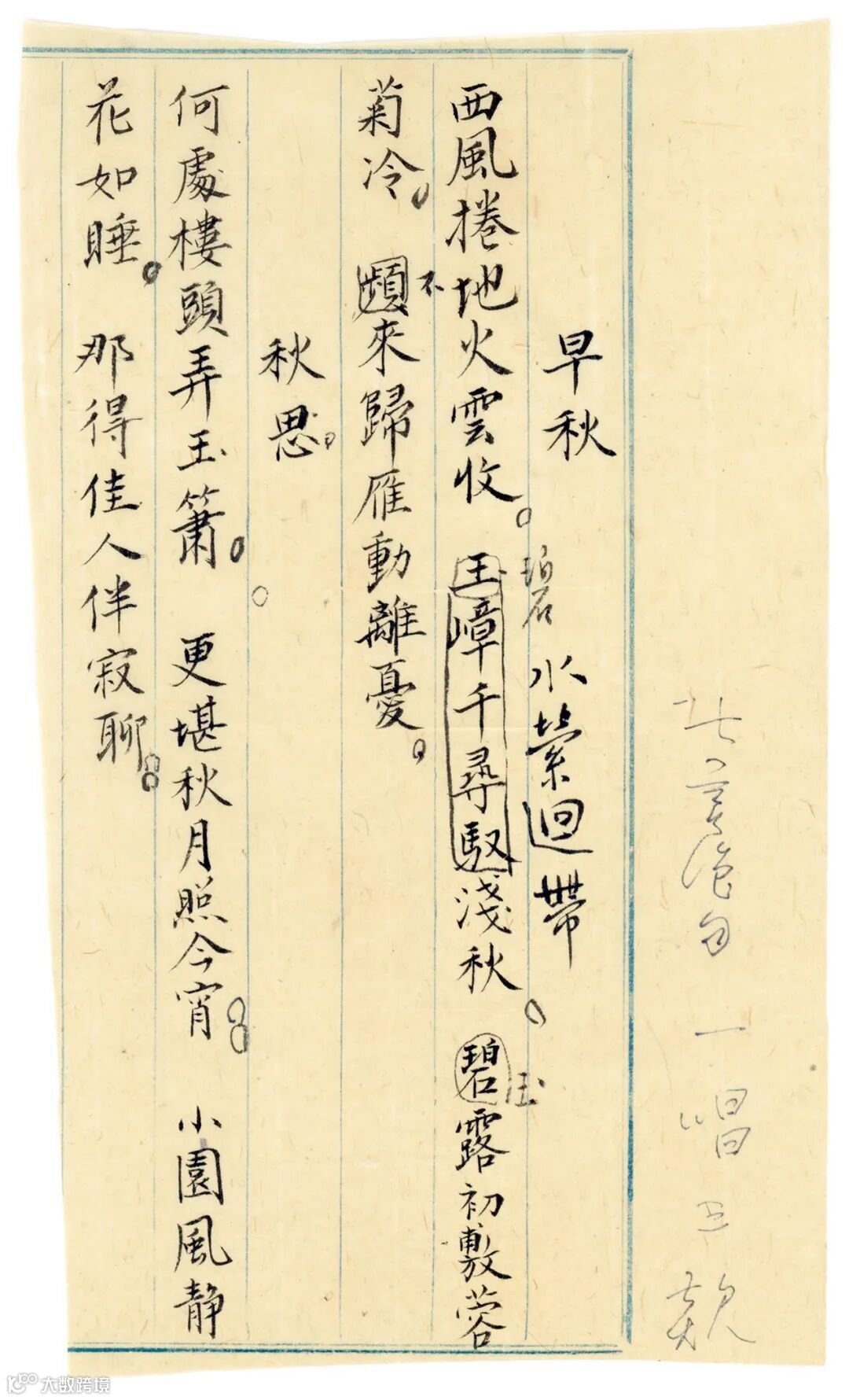 圖 | 安和學詩習作《早秋》《秋思》,可見溥心畬親筆批改痕跡