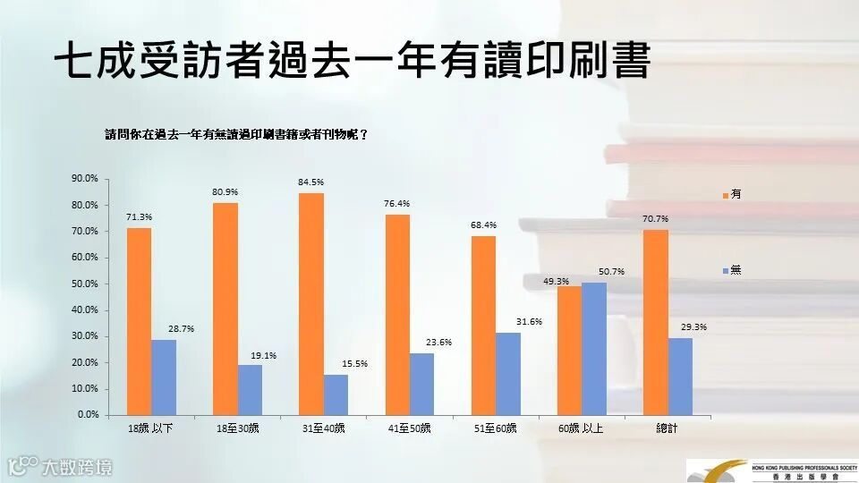 結果顯示,七成受訪者在過去一年有閱讀紙本書,閱讀中位數是八本書,高於去年的七本,而18歲以下人群中的年閱讀中位數達到二十本,遠高於去年的十二本;六成八受訪者有買印刷書籍,兩成八人不會考慮電子書。