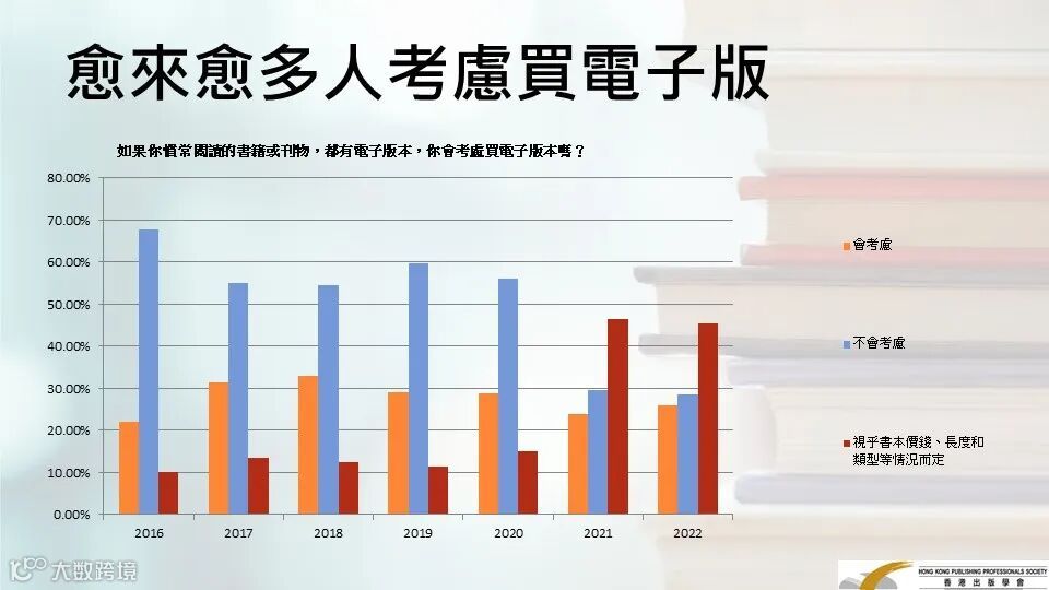 結果反映,紙本閱讀比例與電子閱讀相若,70.7%受訪者過去一年有閱讀紙本書,有電子閱讀習慣的有68.8%,兩者相輔相成下,有閱讀習慣的市民以及閱讀冊數都正在增加,結果正面,而考慮購買電子版的人數比例也在增加。