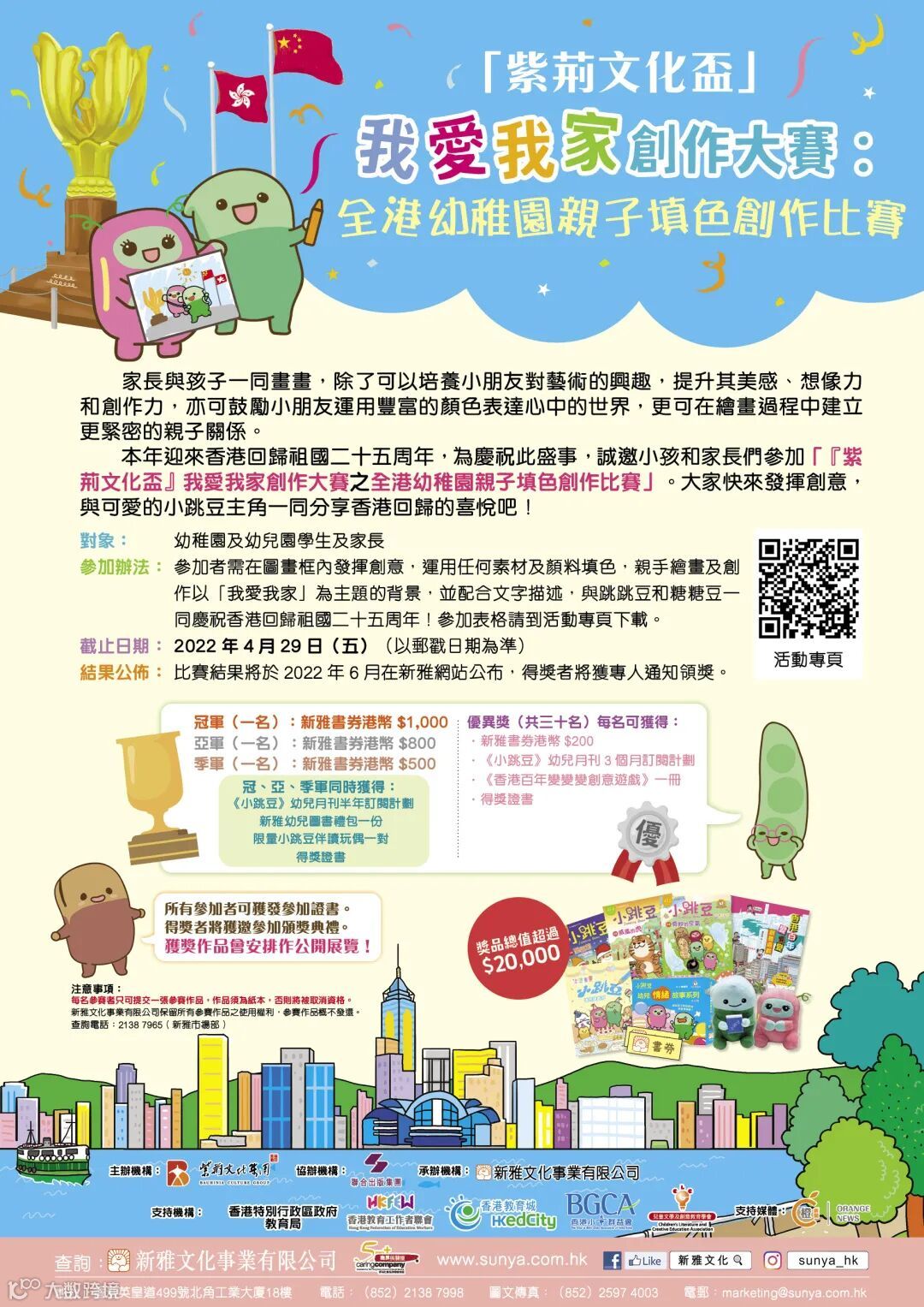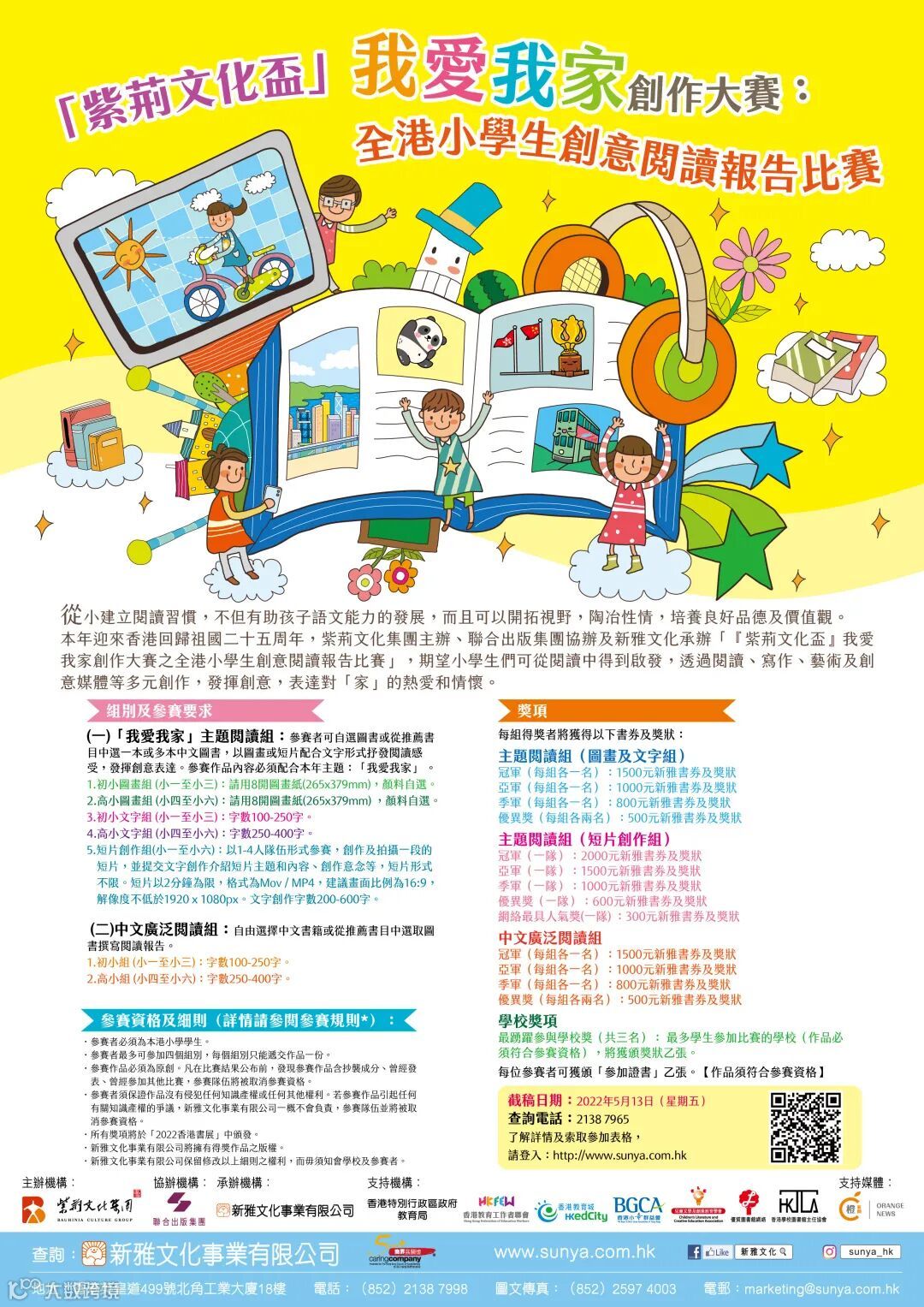今年是香港回歸祖國二十五周年。為慶祝此盛事,誠邀同學、家長和教師參加由紫荊文化集團主辦、聯合出版集團協辦及新雅文化承辦的「『紫荊文化盃』我愛我家創作大賽」!
