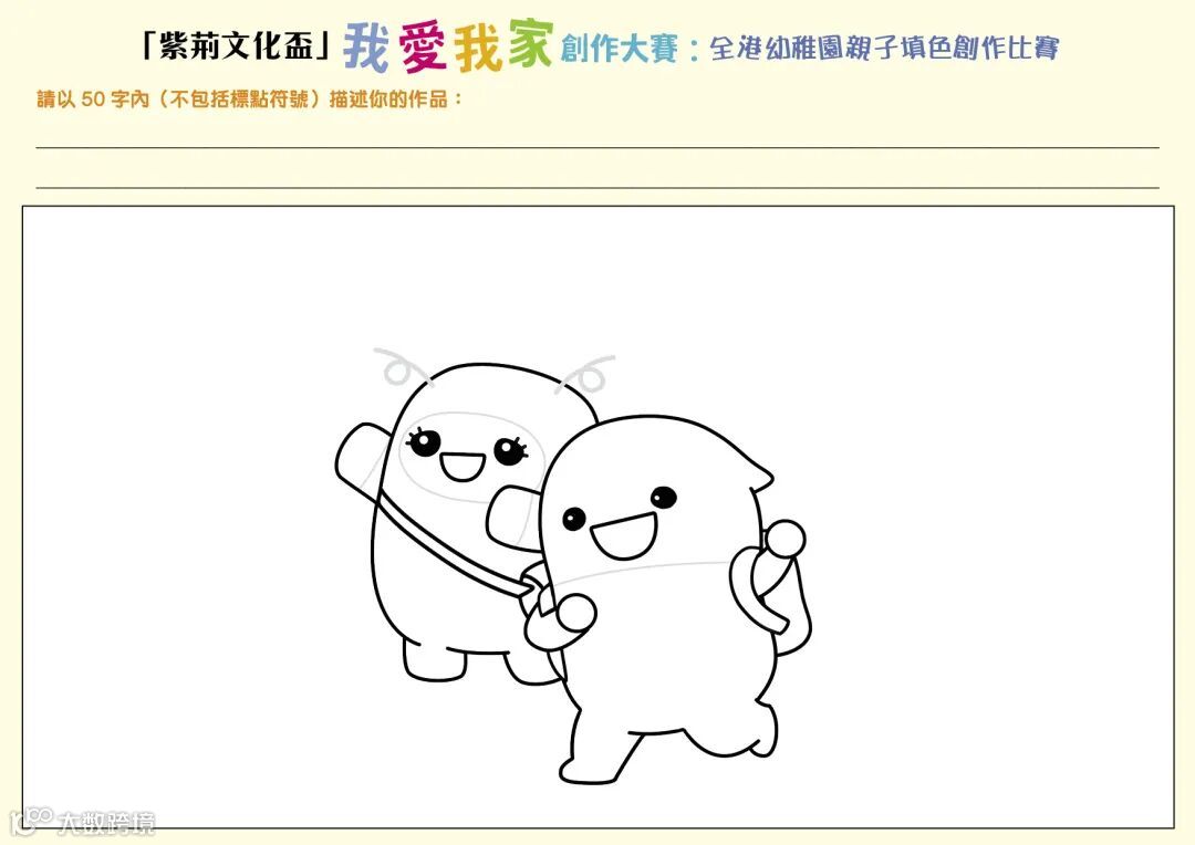 參加者需在參賽表格的圖畫框內發揮創意,運用任何素材及顏料填色,親手繪畫及創作以「我愛我家」為主題的背景,並配合文字描述,與跳跳豆和糖糖豆一同慶祝香港回歸祖國二十五周年!