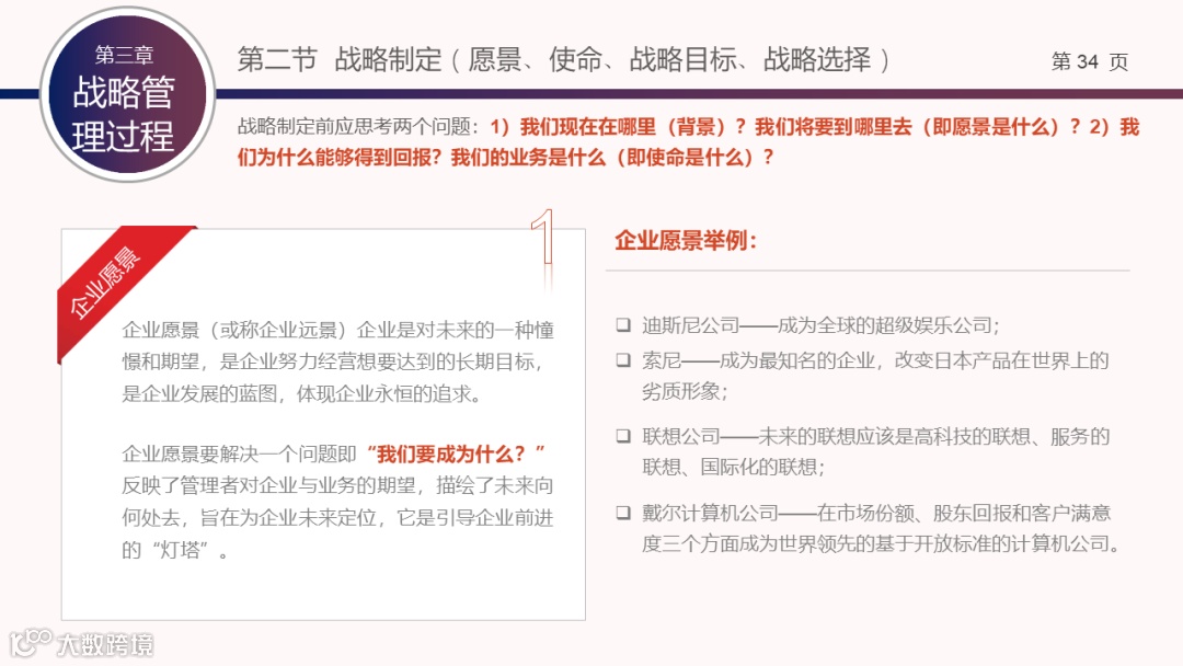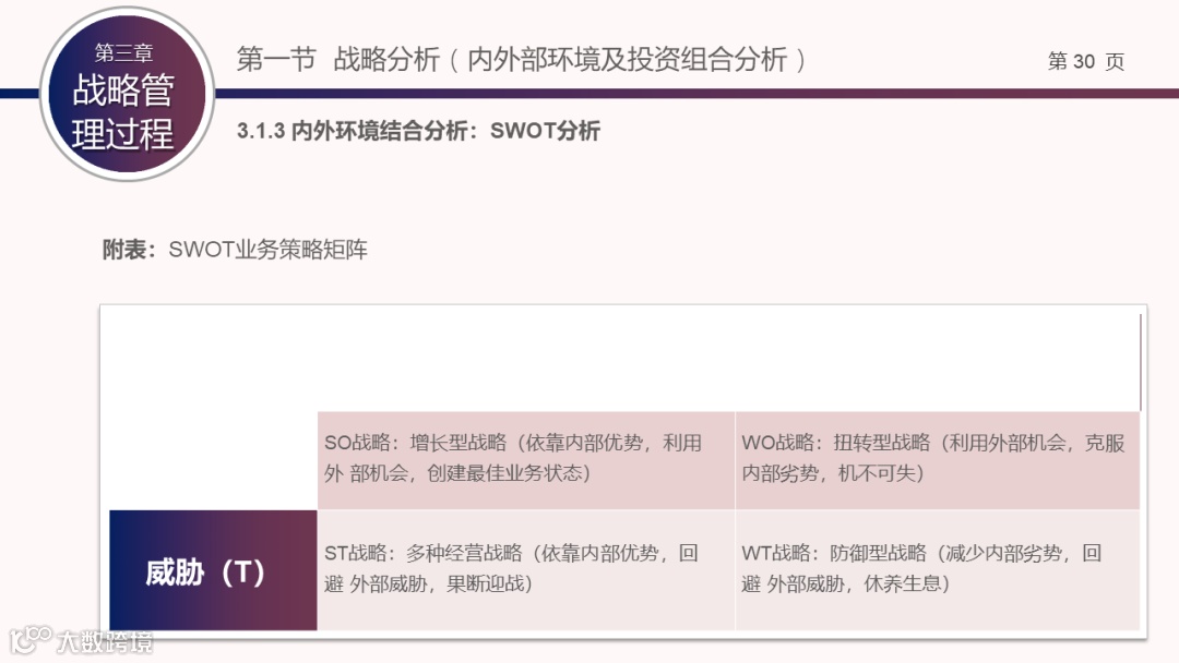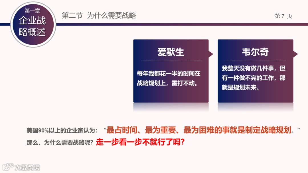 战略就是:指组织为了实现长期的生存和发展,在综合分析组织内部条件和外部环境的基础上做 出的一系列带有全局性和长远性的谋划。通俗地理解:战略就是做正确的事(战术:正确地做事)。