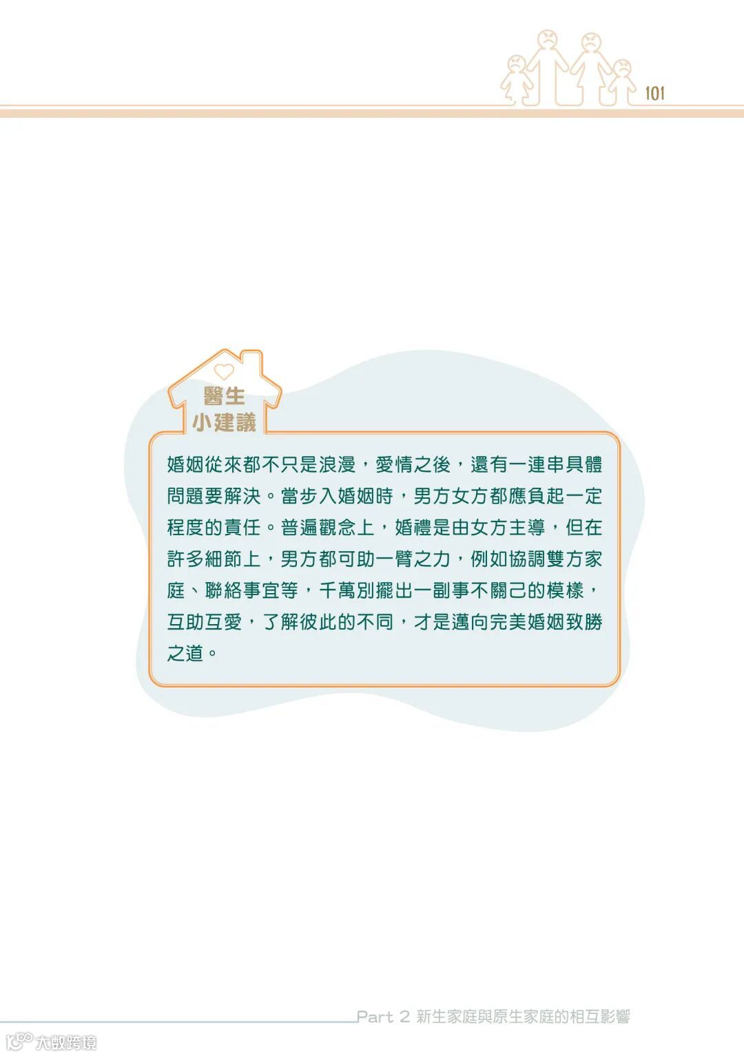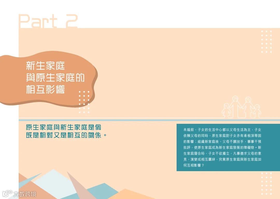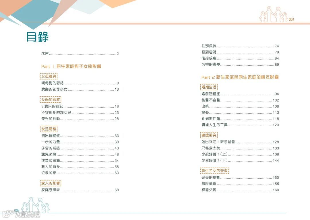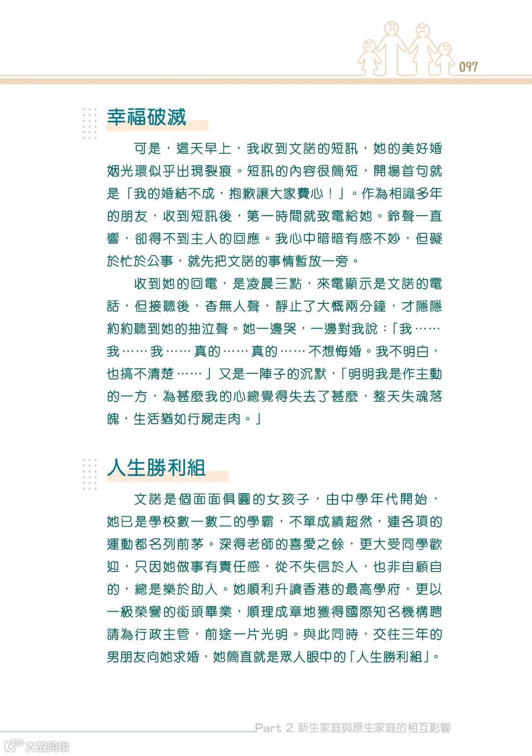 又或者,因為原生家庭的影響,成為了新生家庭發展的阻礙。就像作者在書中所寫的關於中學同學悔婚的個案。就是因為年幼的她,在父母嚴重的爭吵之間,只有力求完美才能得到父母的關注。這樣缺乏安全感的成長經歷和追求完美的性格,很容易讓情緒病趁虛而入。