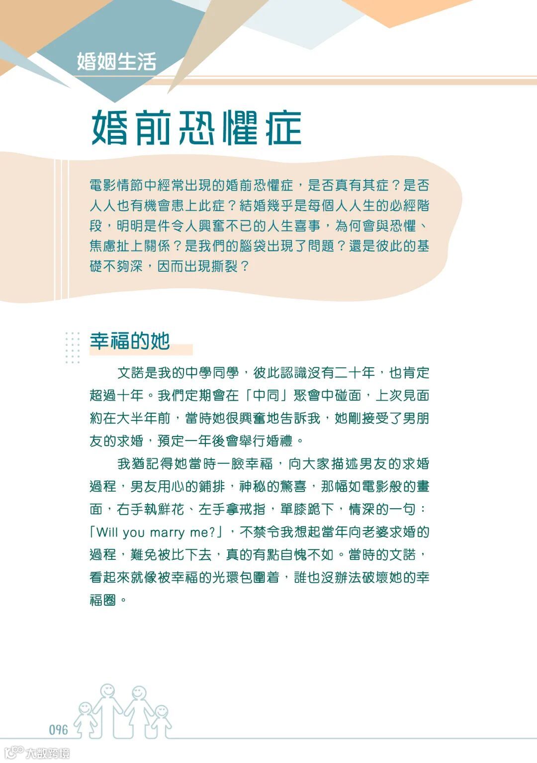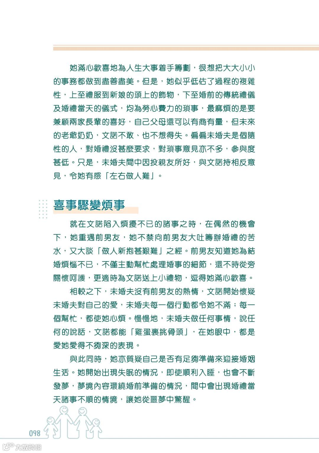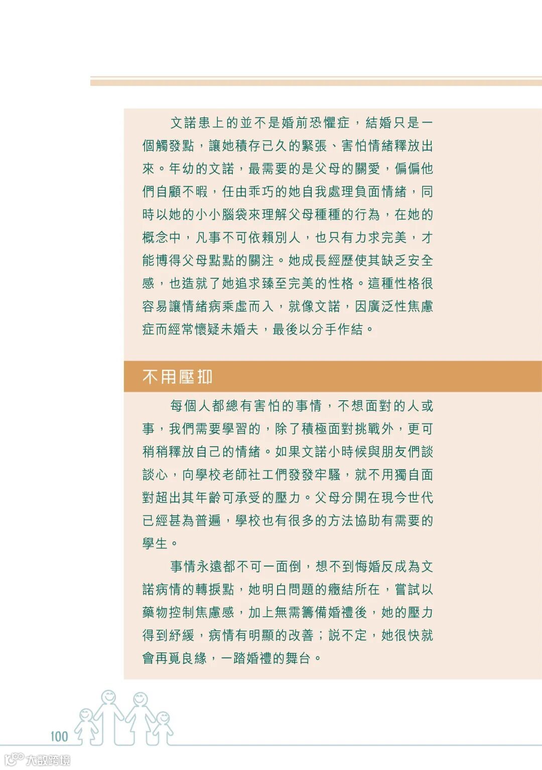 又或者,因為原生家庭的影響,成為了新生家庭發展的阻礙。就像作者在書中所寫的關於中學同學悔婚的個案。就是因為年幼的她,在父母嚴重的爭吵之間,只有力求完美才能得到父母的關注。這樣缺乏安全感的成長經歷和追求完美的性格,很容易讓情緒病趁虛而入。