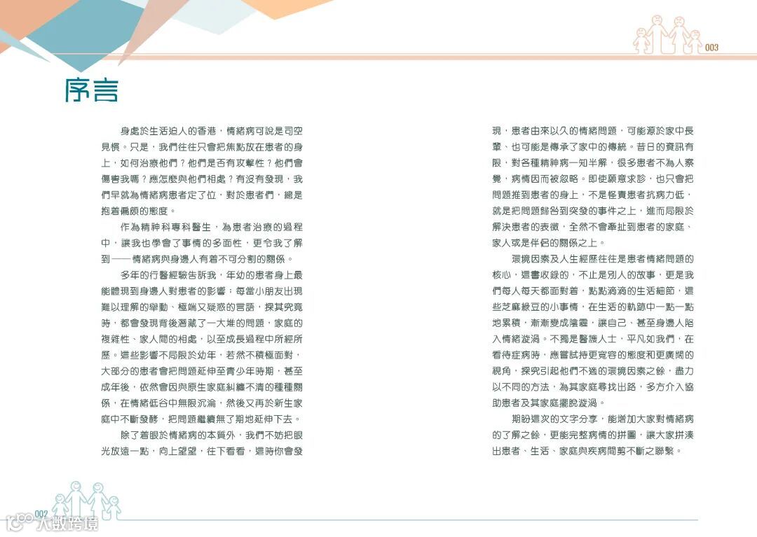 萬里機構出版的《走出家庭壓力漩渦——跟情緒困局說再見》從原生家庭及新生家庭的影響出發,希望更能完整病情的拼圖,讓大家拼湊出患者、生活、家庭與疾病間剪不斷的聯繫。
