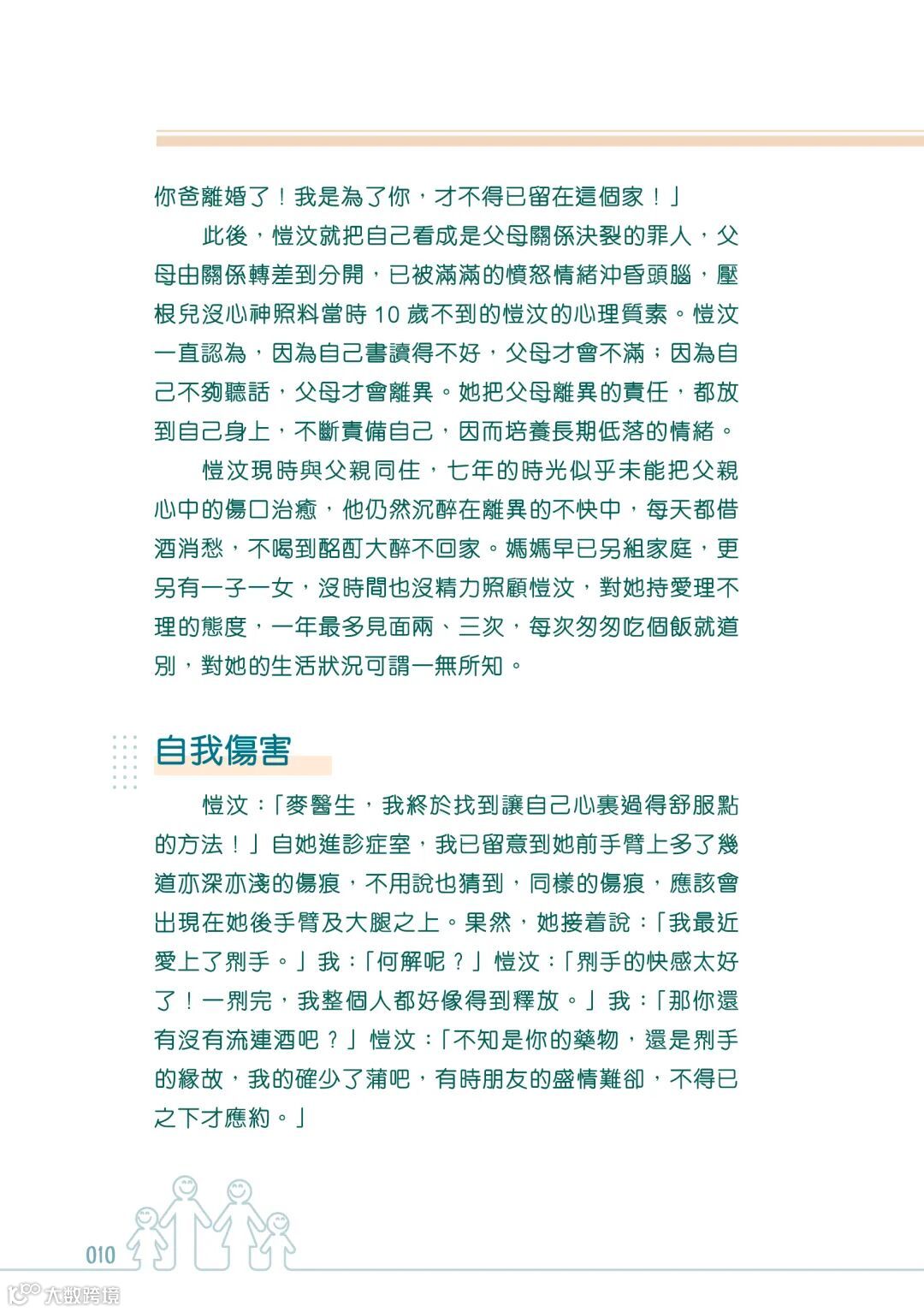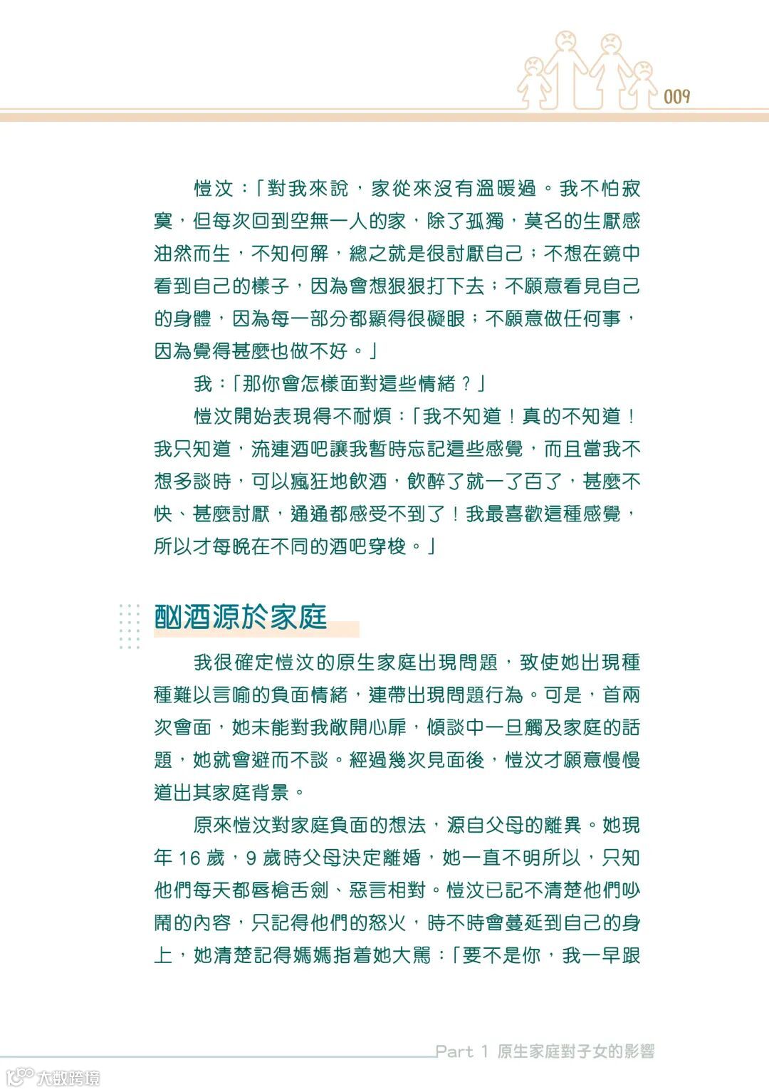 譬如在書中的真實個案中提到,父母的離異使小孩出現種種難以言喻的負面情緒,連帶出現問題行為。小孩會認為自己成績不好,父母才會不滿;因為自己不夠聽話,父母才會離異。把父母離異的責任,都放到自己身上,不斷責備自己,因而培養長期低落的情緒。