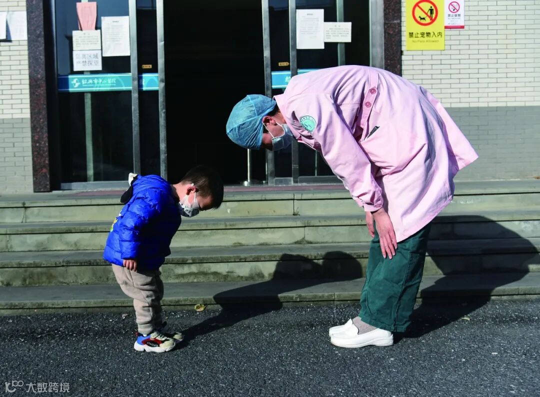 3歲小男孩在浙江省紹興市中心醫院與護士長曹玲玲互相鞠躬致意 | 圖:傅金可