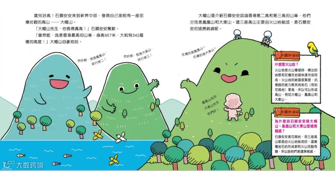 隨後,小朋友可跟着石獅安安認識全香港最高的三座山,他們分別是大帽山、鳳凰山和大東山,「知識加油站」還介紹了火山岩是如何形成。