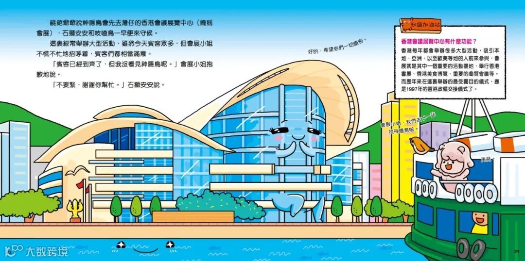 神隱鳥會去了灣仔的香港會議展覽中心,我們一起跟着石獅安安和吱喳鳥來守候神隱鳥,期間安安了解到香港會議展覽中心的功能,是香港舉辦很多大型活動的其中一個重要的活動場地。而歷年來在這裏舉辦的最受矚目的儀式,應是1997年的香港政權交接儀式了。