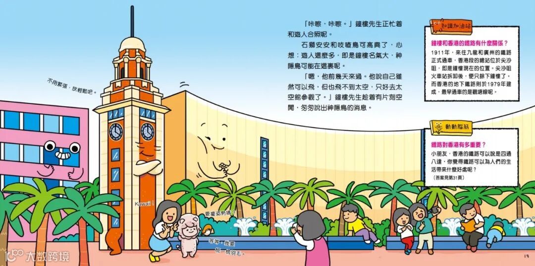 轉眼間來到第三冊,石獅安安和朋友吱喳鳥為了尋找神隱鳥而在香港四處游走。過程中去到香港不同的著名建築物參觀。來到尖沙咀鐘樓就一起了解尖沙咀火車站和這鐘樓的歷史。