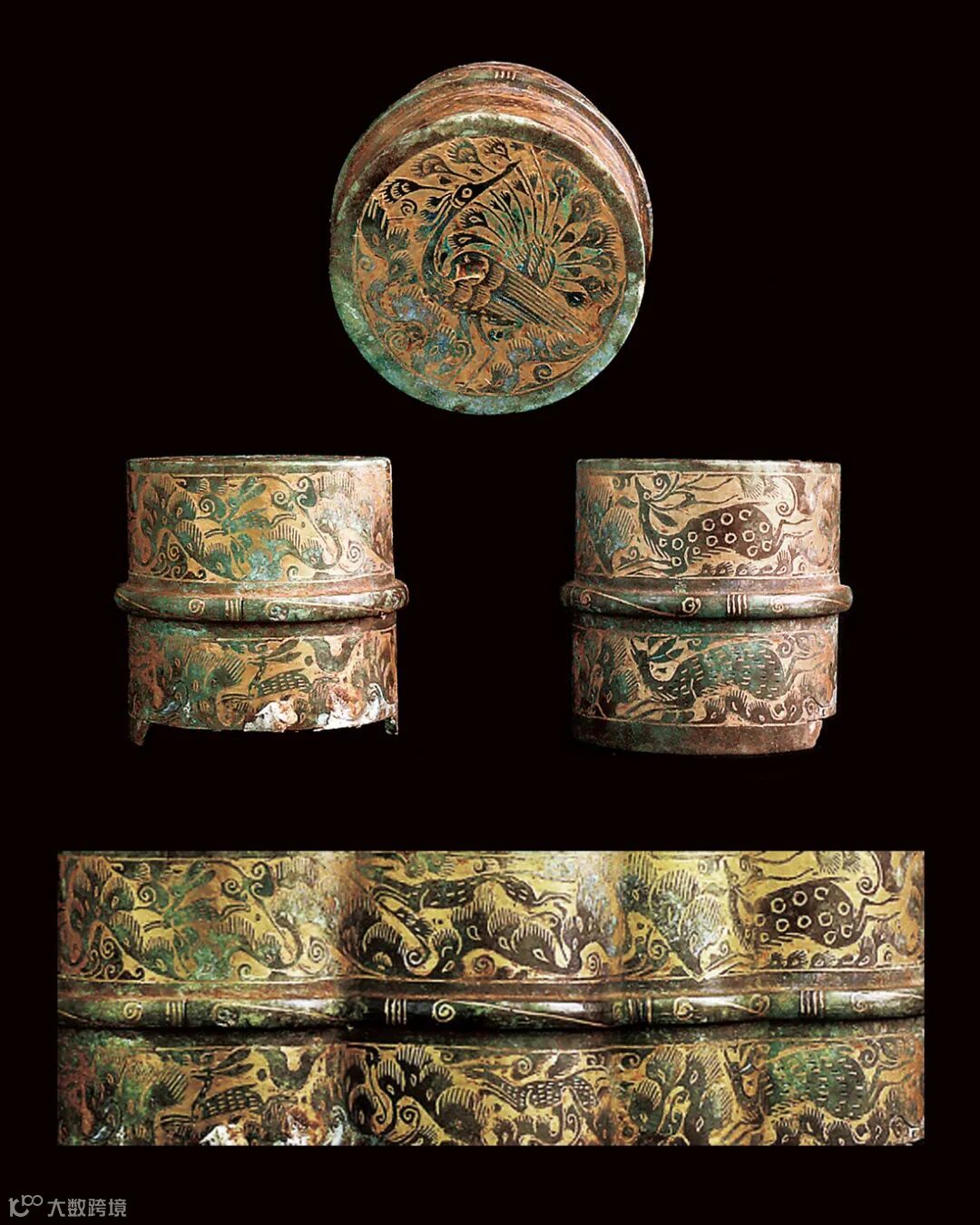 青銅缶是東周時酒器,蓋子可以打開,這件器物以「失蠟法」製成,代表了中國當時青銅工藝的最高水平。當是墓主生前珍藏。