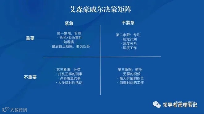 艾森豪威尔(Eisenhower )的另一个重要经验是他的决策矩阵。它要求你将任务分成2×2的网格,以确定任务是否重要以及是否紧急。