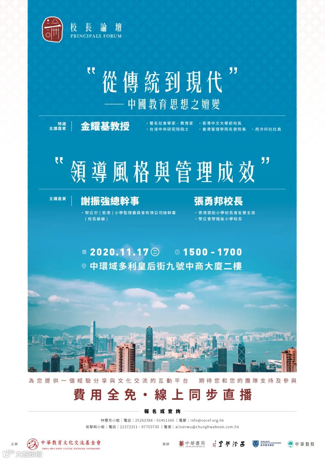首場「校長論壇」吸引近百間中、小、幼學校的校長齊聚一堂,逾百人線上線下共同討論香港教育的未來願景。首場「校長論壇」分為兩部分,第一部分邀請到著名社會學家、教育家金耀基教授(香港中文大學前校長、台灣中央研究院院士、香港管理學院名譽院長、西泠印社社員)以「從傳統到現代──中國教育思想之嬗變」為題作開篇之講,探討中國教育思想之變化。第二部分則由聖公宗(香港)小學監理委員會有限公司總幹事謝振強先生及香港資助小學校長會名譽主席、聖公會聖雅各小學校長張勇邦先生對談:「領導風格與管理成效」。
