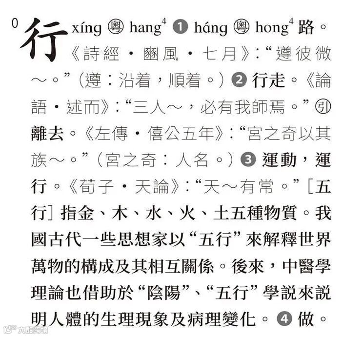 ,狀如道路),到由近至遠的引申義「道路」、「運動」、「做」、「品行」……展開「行」字在古代漢語裏的意義引申系統,每個義項配合的例句,從《詩經·豳風·七月》的「遵彼微行」起,到取自《論語》《左傳》《荀子》等,大多數都是廣為人知的先秦兩漢典籍裏的句子(此例參考最新的第五版),不偏不怪。義項講解,書證舉例,都盡量明明白白,嚴謹而不故弄玄虛。