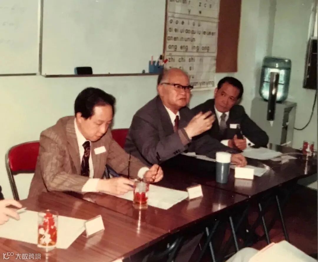 王力先生學貫中西,在世時與香港文教界亦時有交往,上圖為1981年春,王力先生(中)、香港教育家杜祖貽博士(左)在香港「語文教育與文化」研討會上。| 圖:《中國現代文學精華》