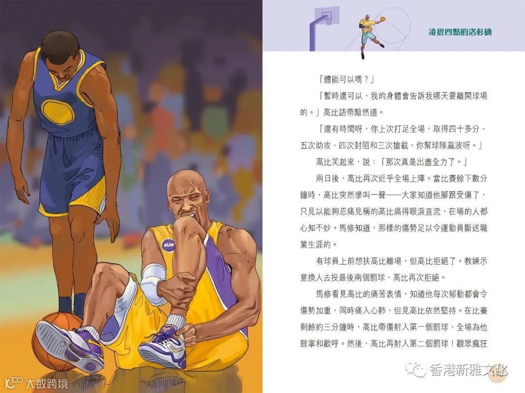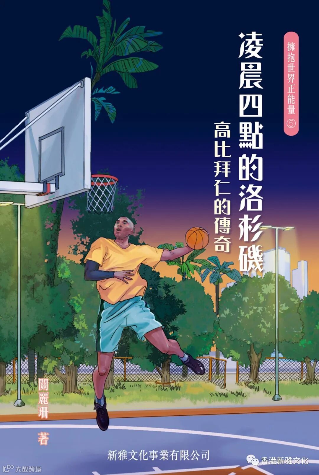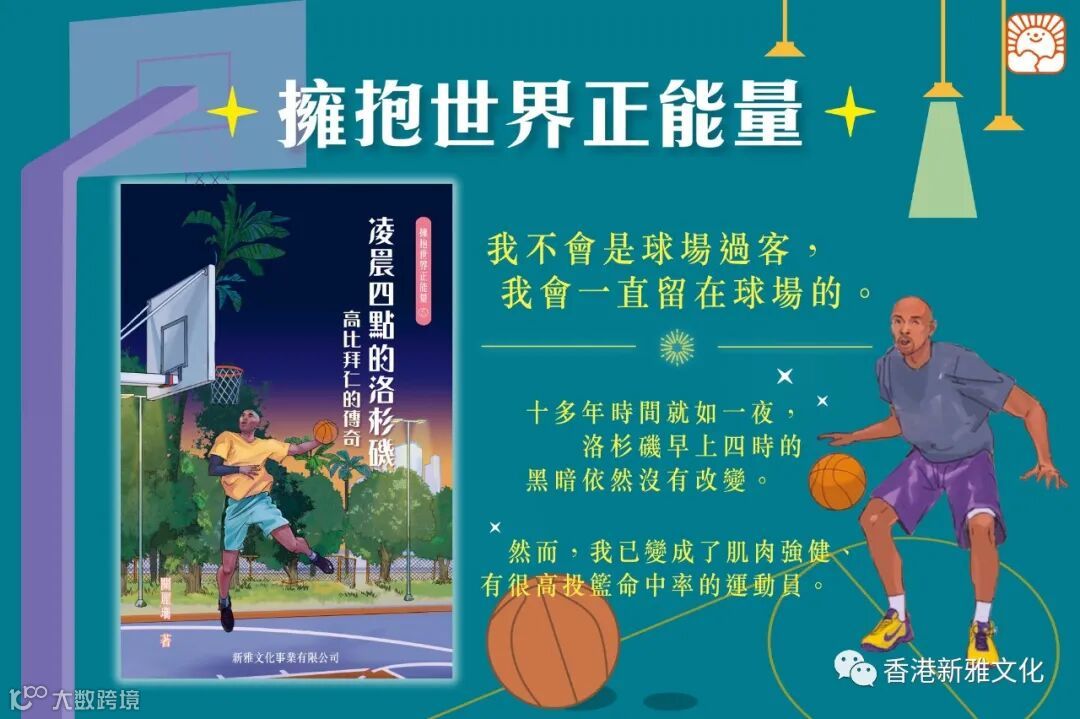 新雅文化策劃《擁抱世界正能量》系列,作者關麗珊以真人真事改編而成,藉此鼓勵大家學習正向思維,並相信愛能改變世界!第五冊《凌晨四點的洛杉機——高比拜仁的傳奇》以高比拜仁的故事為藍本,一起經歷這位籃球巨星的一生。