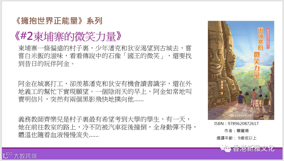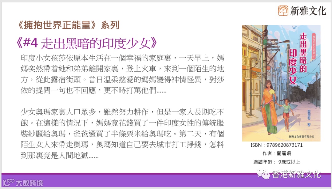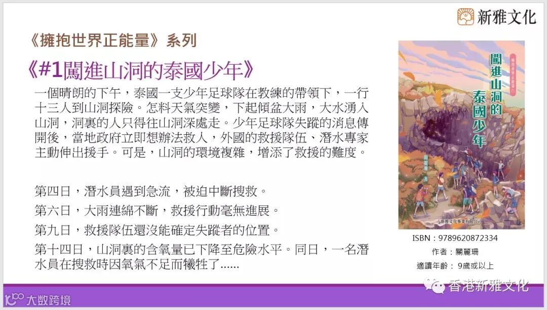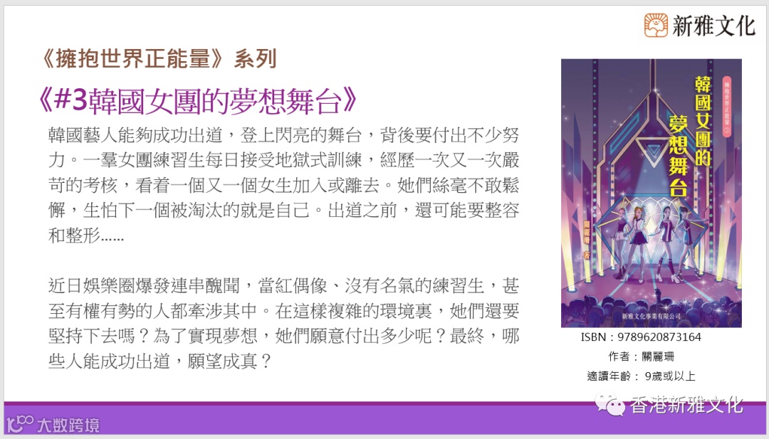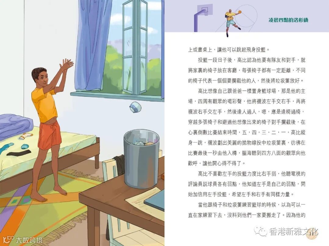 新雅文化策劃《擁抱世界正能量》系列,作者關麗珊以真人真事改編而成,藉此鼓勵大家學習正向思維,並相信愛能改變世界!第五冊《凌晨四點的洛杉機——高比拜仁的傳奇》以高比拜仁的故事為藍本,一起經歷這位籃球巨星的一生。