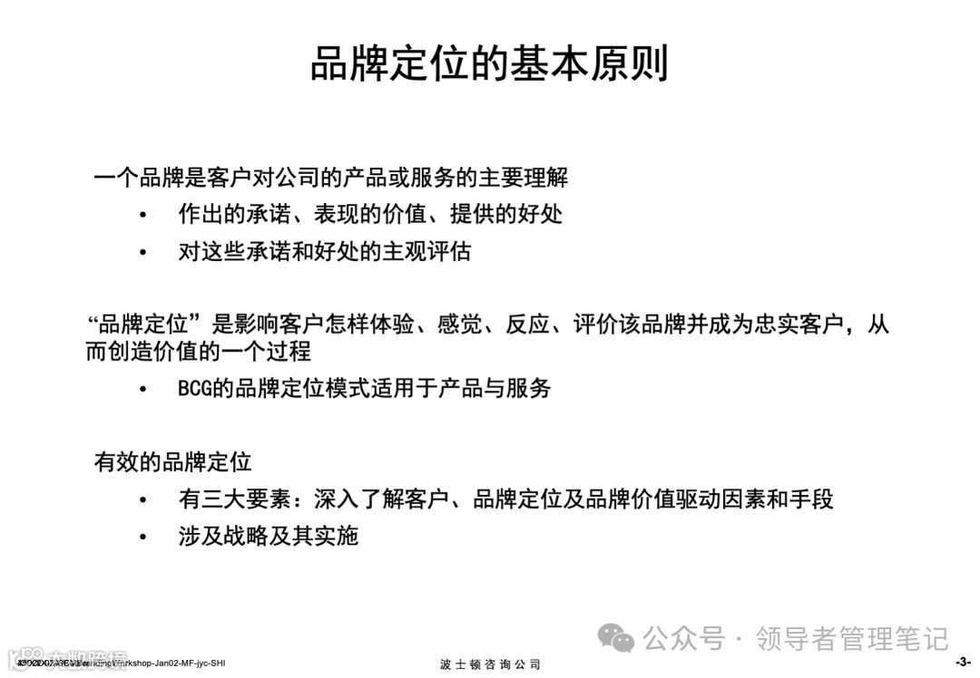 波士顿咨询的这份品牌分析文档,本质是为企业提供“从品牌‘是什么’到‘怎么做’的完整行动指南”。其核心逻辑可概括为:以“客户价值”为核心,通过“清晰定位”明确方向,以“一致执行”落地承诺,用“科学管理”保障长期价值。无论是产品型还是服务性品牌,均需围绕这一逻辑,平衡“短期业绩”与“长期资产”,才能打造出具有竞争力的强势品牌。