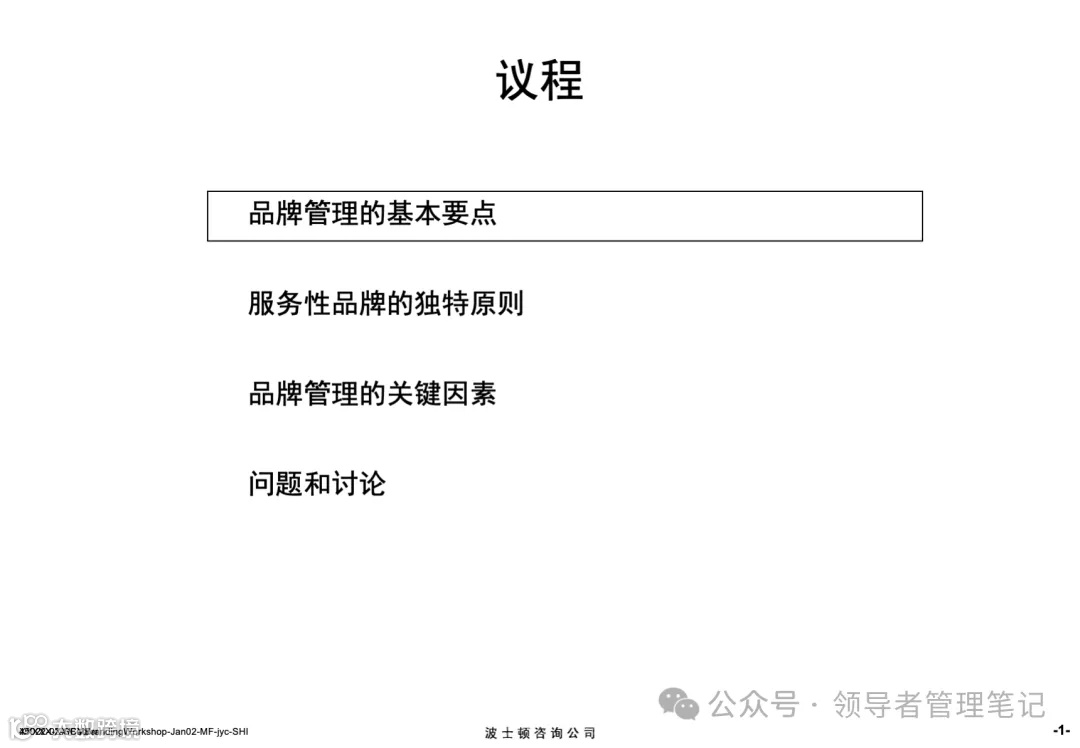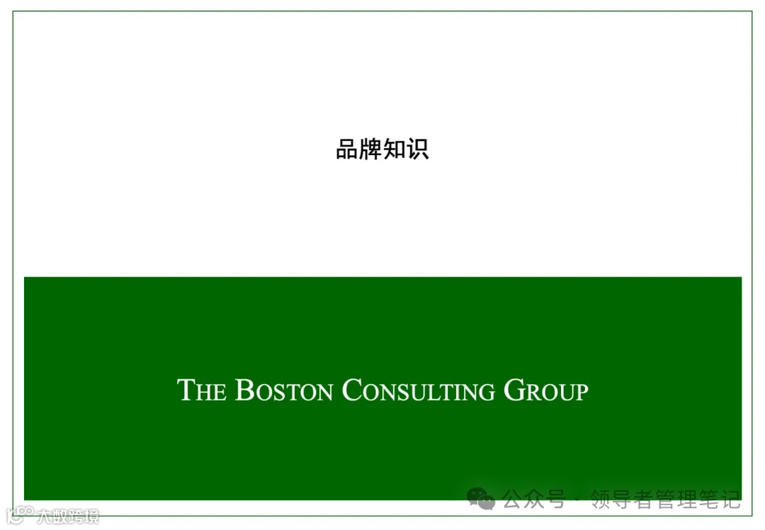 38页文档《商业分析工具:波士顿咨询品牌分析》.pptx是波士顿咨询(BCG)关于品牌分析的专业培训资料,以PPT形式呈现,共涵盖“品牌管理基本要点”“服务性品牌独特原则”“品牌管理关键因素”“问题和讨论”四大核心模块。
