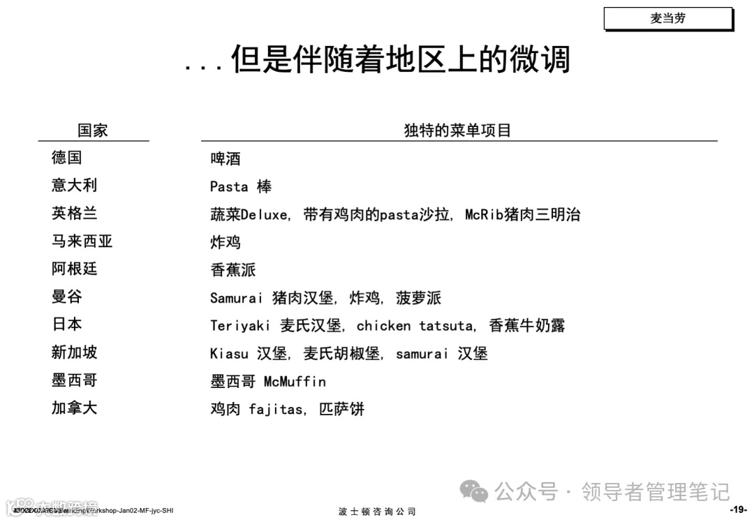区域微调的本地化适配:针对不同国家的饮食文化调整菜单,如日本推出“Teriyaki麦氏汉堡”、德国提供“啤酒”、泰国推出“菠萝派”,平衡“标准化”与“本地化”需求。