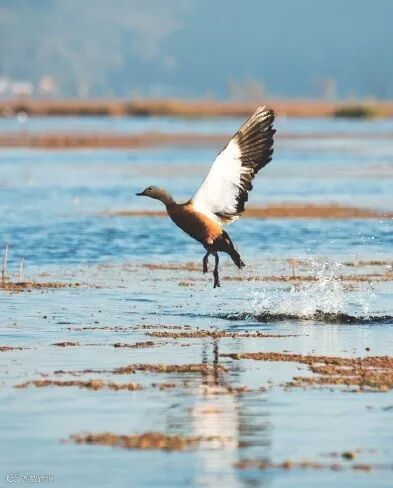 來此越冬的赤麻鴨從夕陽的湖面飛起