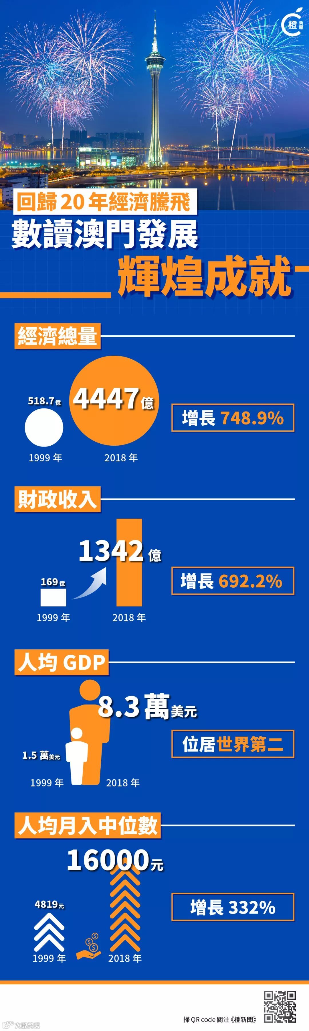 在過去二十年間,澳門社會經濟發展發生了很多重大突破和變化,特別行政區「一國兩制」實踐充滿了探索的勇氣和智慧,特區治理過程中很多大事的發生都創造了澳門發展歷史上的紀錄。從1999 年至2018 年,澳門本地的生產總值由502.7 億澳門元,增加到4,403 億澳門元,增長7.8倍。人均生產總值由1.5 萬美元,增至8.3 萬美元,增長了4.5 倍,全世界排第二,整體上實現了經濟的持續高速增長和飛躍性的提升。澳門特區人均GDP 在亞洲超過新加坡而成為名副其實的亞洲城市首富,在全世界人均GDP 排名中則超過了歐洲的瑞士而僅次於全球第一位的盧森堡。作為文化旅遊勝地,人口數僅有60 多萬的澳門總出入境人次及入境旅客數量不斷攀升、屢創新高, 2018 年分別突破1.79億人次及3,580 萬人。連接澳門與珠海的拱北口岸2018 年客流總數高達1.34 億人次,同比增長約5% ,第七年位居全國首位而成為我國出入境客流量第一大口岸。