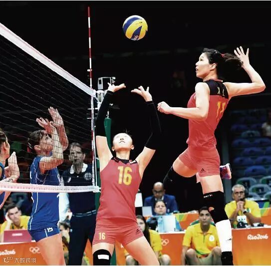 里約當地時間2016年8月8日,奧運會女排小組賽第二場中國隊對戰意大利隊,最終以3比0戰勝意大利隊。圖為徐雲麗(右)扣球。