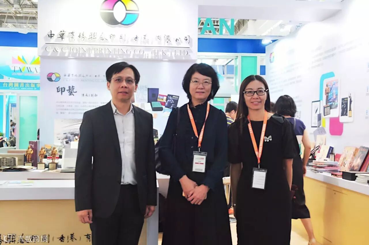 集團副總裁梁兆賢(左)與北京華聯印刷公司總經理朱敏(右),陪同國家新聞出版廣電總局進口管理司副巡視員王華(中)參觀我集團展位