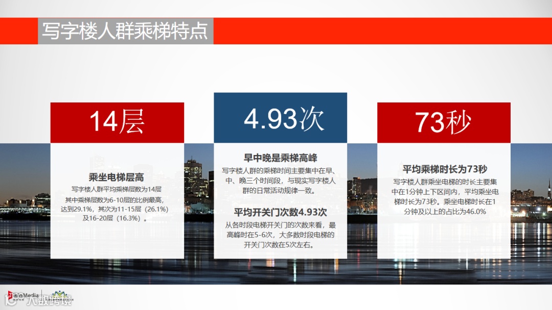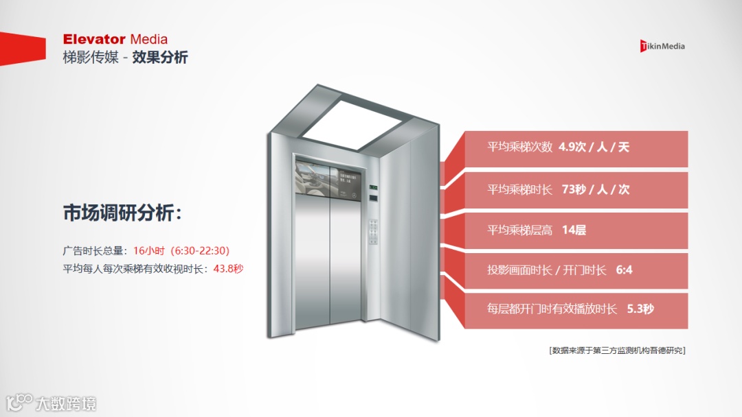 还有,受众从来不会每一次都能把广告完完整整地看完,他只会在首次触达广告片源的时候有个完整记忆,往下每一次重复播放时都是碎片化的、被迫式的强化记忆。虽然有些媒体的视频广告可以完整播放,但没有人盯着同一个广告片重复观看。因此,应该更加在意受众的有效收视时长,而不是广告的曝光时长,梯影的收视时间毋庸置疑是电梯媒体中最高的。