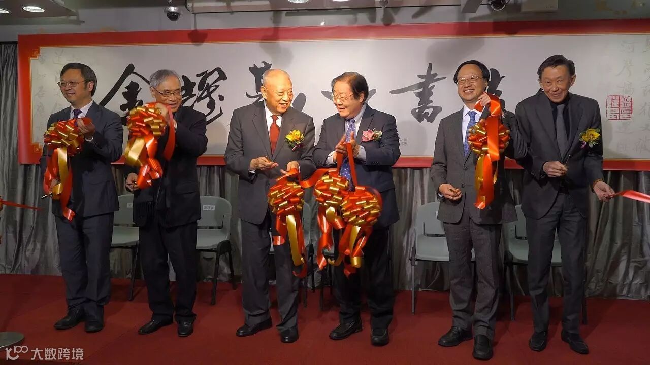 主禮嘉賓(左起)文宏武、劉遵義、董建華、江宜樺與董橋一同為展覽剪綵