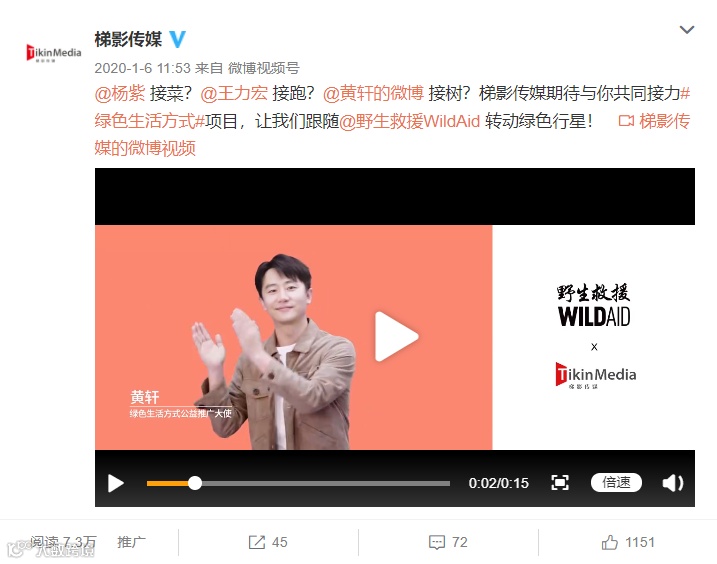 此外,梯影还积极参与微博公益话题,与大V联名互动。例如,助力野生救援推广系列科普纪录片《海龟奇援》,共同为野生动物发声。还与明星共同接力#绿色生活方式#项目,单条微博点赞数破千,阅读量超过7万,取得了良好的宣传效果。