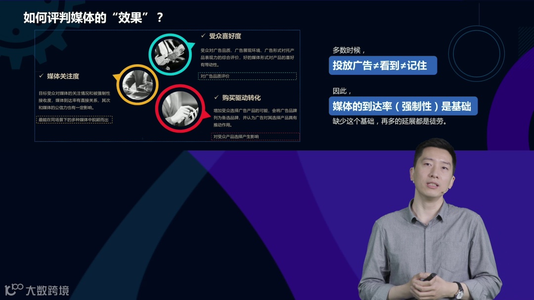 特别指出,缺少品牌积淀的广告可能让消费者在购买决策时缺少临门一脚,而单纯推品牌不注重实效的广告会因为转化滞后而让效力消失殆尽。多数时候,投放广告≠看到≠记住,因此媒体的到达率(强制性)是基础,缺少这个基础,再多的延展都是徒劳。碎片化的信息轰炸时代,犹如沙漠里挖井,消费者是健忘的、是容易被新信息覆盖的,广告主需要集中火力高频冲击。