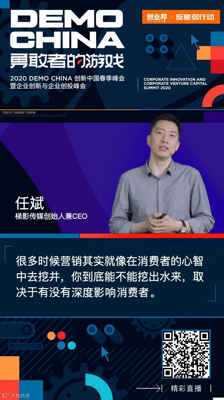 本届DEMO CHINA创新中国春季峰会采用线上直播的方式,不仅完全还原线下峰会的视听盛况,更打造出云会展平台,涵盖到关于创新互动的不同维度。梯影传媒创始人兼CEO任斌在直播中金句频出,通过相关优质案例,阐释了梯影在当下经济低谷期所做的创新与尝试,表现出不达目的不罢休的果敢与坚毅,给同行的勇士们带来许多信心与启发。