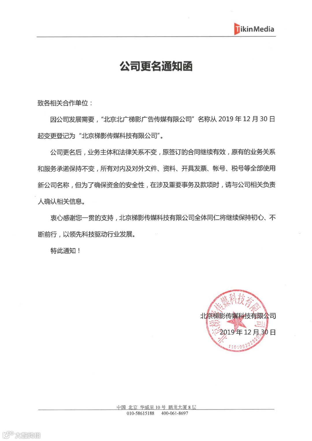 为了更加凸显公司作为创新型媒体所蕴含的科技力量,且更突出公司长久以来坚持用新技术去不断自我迭代的科技属性,经工商行政主管部门核准,“北京北广梯影广告传媒有限公司”名称从2019年12月30日起变更登记为“北京梯影传媒科技有限公司”。公司简称不变,仍为“梯影传媒”。