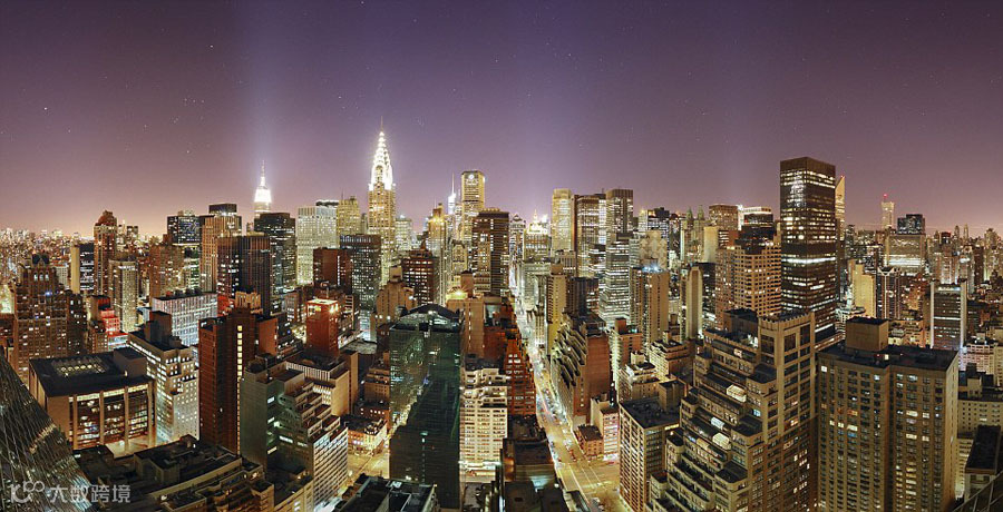 夜晚明亮如昼的纽约曼哈顿,一座生机勃勃的钢铁丛林。
