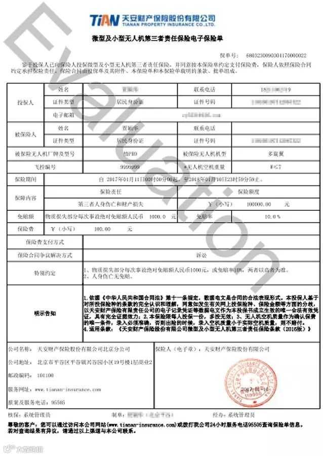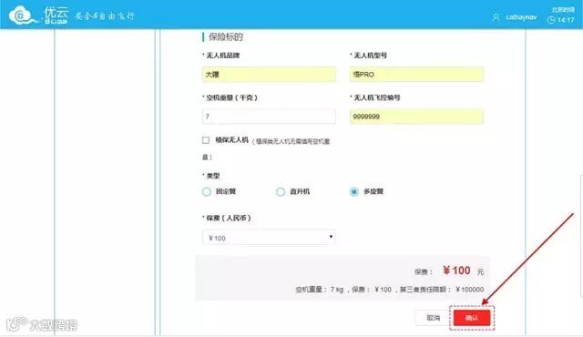通过优云(U-Cloud)在线购买保险的无人机用户,即可保障无人机或从无人机上坠物造成第三者的人身伤亡,又可保障第三者的财产损失,双重保障使无人机用户无忧飞行。