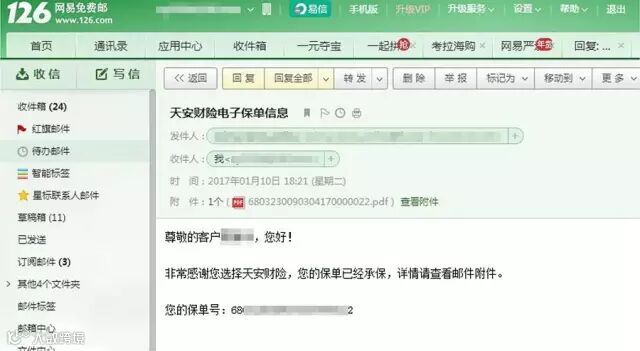 七、付款成功后,您将收到邮件及短信确认回复,及电子保单信息(如下所示)