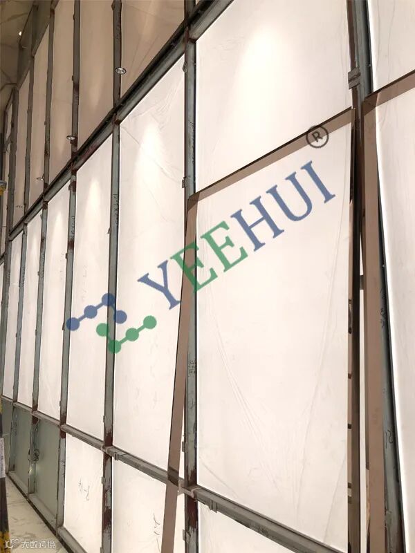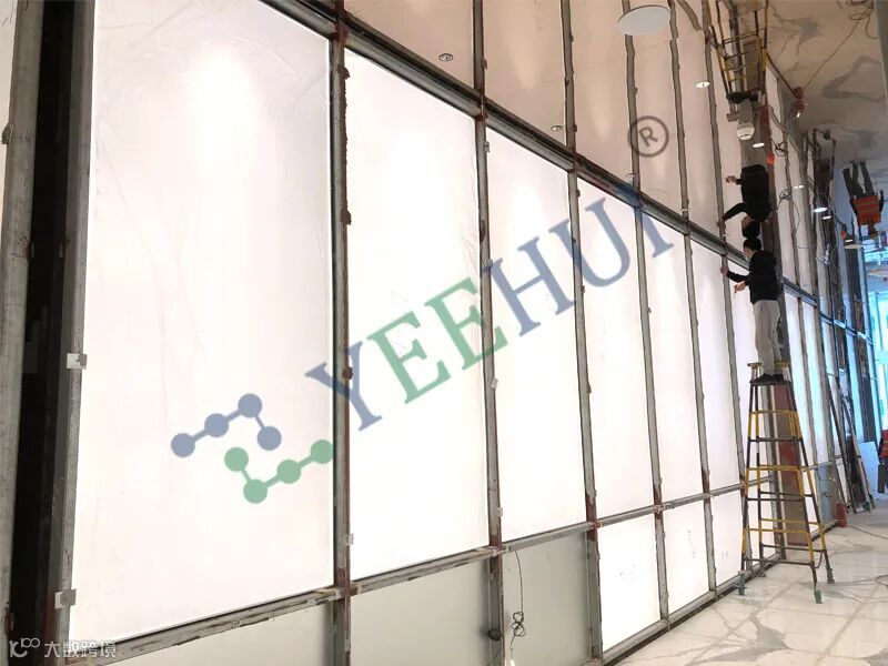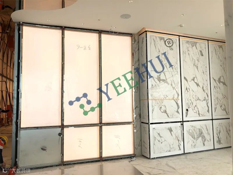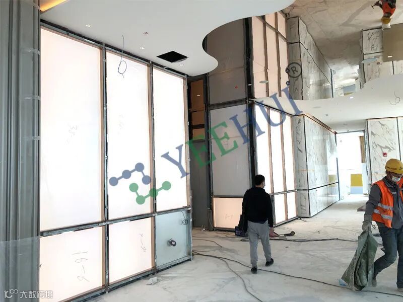 此次产品采用的是本公司自主研发的AF0808发光板,产品采用专用散热铝材、激光雕刻导光板及专用LED光源。现场安装的发光板最大尺寸2.63*1.45米,最小尺寸0.88*0.165米,产品整体厚度仅为10mm。客户对发光板整体安装效果表示满意!