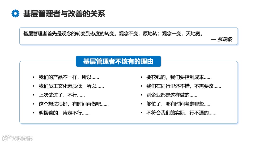某服装车间的老员工发现,缝纫时频繁转身取线团浪费时间,便建议在缝纫机旁加装一个可旋转的线架,这个小改善让每人每天多缝5件衣服。基层管理者是改善的“催化剂”,但常被固有观念束缚——“我们的产品特殊,改不了”“员工文化低,学不会新方法”,这些借口本质上是对现场潜力的忽视。